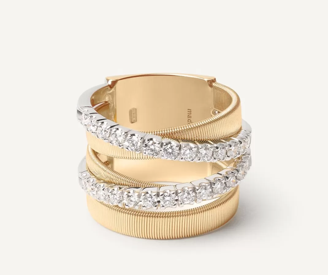 Une Elegante Bague Multi-Rangs En Or Jaune 18 Carats. Des Rangs De Spirale Plate, Realisee Selon Un Savoir-Faire Exclusif, Sont Entrelaces Avec D’Elegants Anneaux Sertis De Diamants Taille Brillant. L’Ensemble Cree Un Jeu De Lumiere Sophistique Pour Une Bague Raffinee Et Intemporelle.