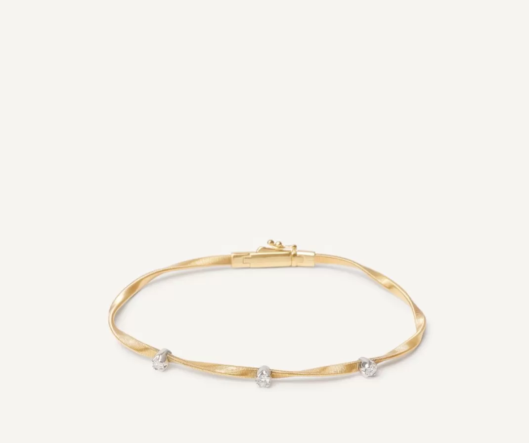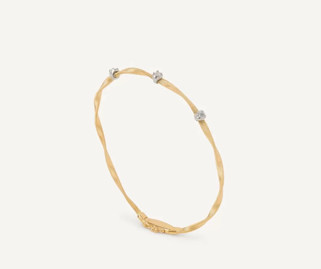 Un Elegant Rang De Spirale Torsadee, Realisee Selon Un Savoir-Faire Exclusif, Rehausse De Trois Diamants Taille Brillant. En Or Jaune 18 Carats, Ce Bracelet Est Parfait Seul, Ou Associe Aux Autres Bijoux Marco Bicego. Une Merveilleuse Declaration De Style.
