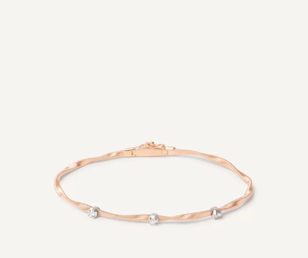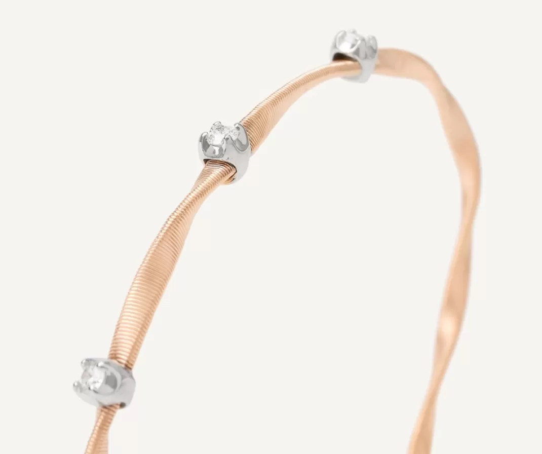Un Elegant Rang De Spirale Torsadee, Realisee Selon Un Savoir-Faire Exclusif, Rehausse De Trois Diamants Taille Brillant. En Or Rose 18 Carats, Ce Bracelet Est Parfait Seul, Ou Associe Aux Autres Bijoux Marco Bicego. Une Merveilleuse Declaration De Style.