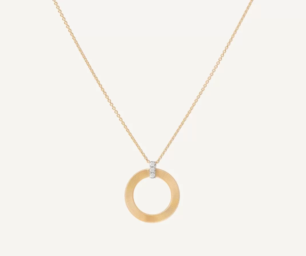 Un Element Rond En Rang De Spirale Plate, Realisee Selon Un Savoir-Faire Exclusif, Definit Ce Pendentif En Or Jaune 18 Carats, Avec Chaine Reglable. A La Fois Sophistique Et Epure, Il Est Rehausse D’Une Beliere En Diamants Taille Brillant. Polyvalent Et Elegant, Il Est Parfait Au Quotidien.